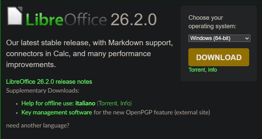 LibreOffice 26.2 è disponibile per Windows, macOS e Linux e supporta oltre 120 lingue. Può essere utilizzato a casa, nelle aziende, nelle scuole e nelle istituzioni pubbliche, senza costi di licenza e senza vincoli di fornitura.