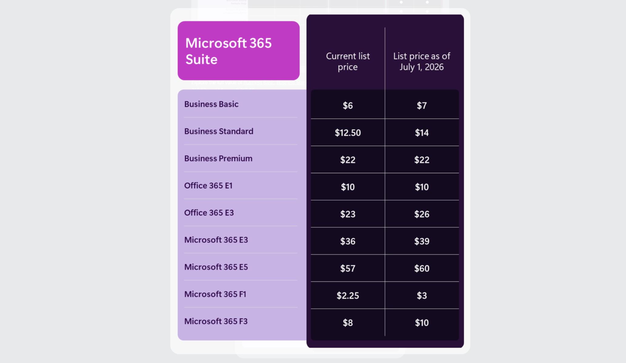 Accanto all’introduzione delle nuove capacità, Microsoft ha pubblicato l’elenco degli aggiornamenti ai prezzi che entreranno in vigore dal 1° luglio 2026. Le modifiche saranno applicate a livello globale con adeguamenti per i mercati locali e includeranno anche i piani destinati alle organizzazioni non profit.