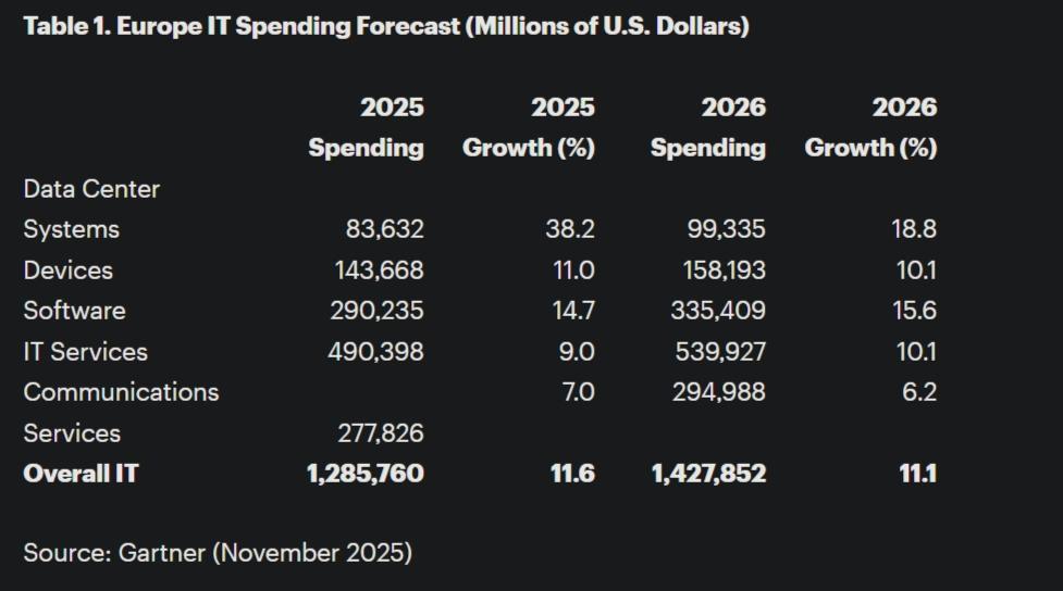 Un’eccezione importante riguarda i data center. In Europa, la spesa in questo comparto crescerà del 38,2% nel 2025, raggiungendo 83,6 miliardi di dollari, per poi rallentare ma mantenere comunque un ritmo sostenuto del 18,8% nel 2026. Il risultato sarà un mercato da 99,3 miliardi di dollari, spinto dal bisogno di infrastrutture che supportino IA, cloud ibrido e workload sempre più complessi.