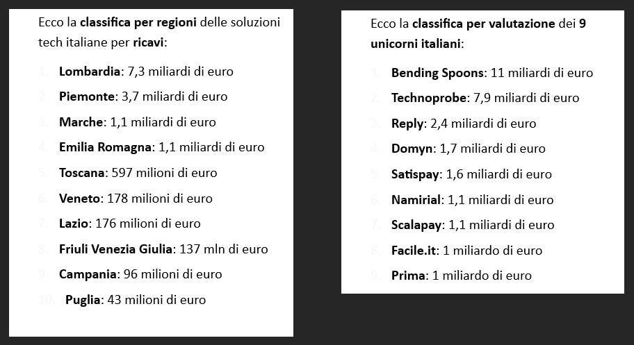 A confortare queste considerazioni c’è il fatto che le soluzioni tech italiane censite sono più che raddoppiate. Si è infatti passati da 456 a oltre 1.000 in un anno di analisi, distribuite su più di 20 categorie, con l’ingresso di nuovi segmenti ad alto valore come quello degli “unicorni”, ovvero start-up con un valore che supera il miliardo di euro. Il report ha censito 9 unicorni italiani, che in totale hanno una valutazione complessiva di 28,8 miliardi di euro e pesano sul PIL nazionale per lo 0,28%. I ricavi complessivi generati da queste realtà, che impiegano oltre 23.000 persone, ammontano a 5,67 miliardi di euro, con una media di 630 milioni a testa.
