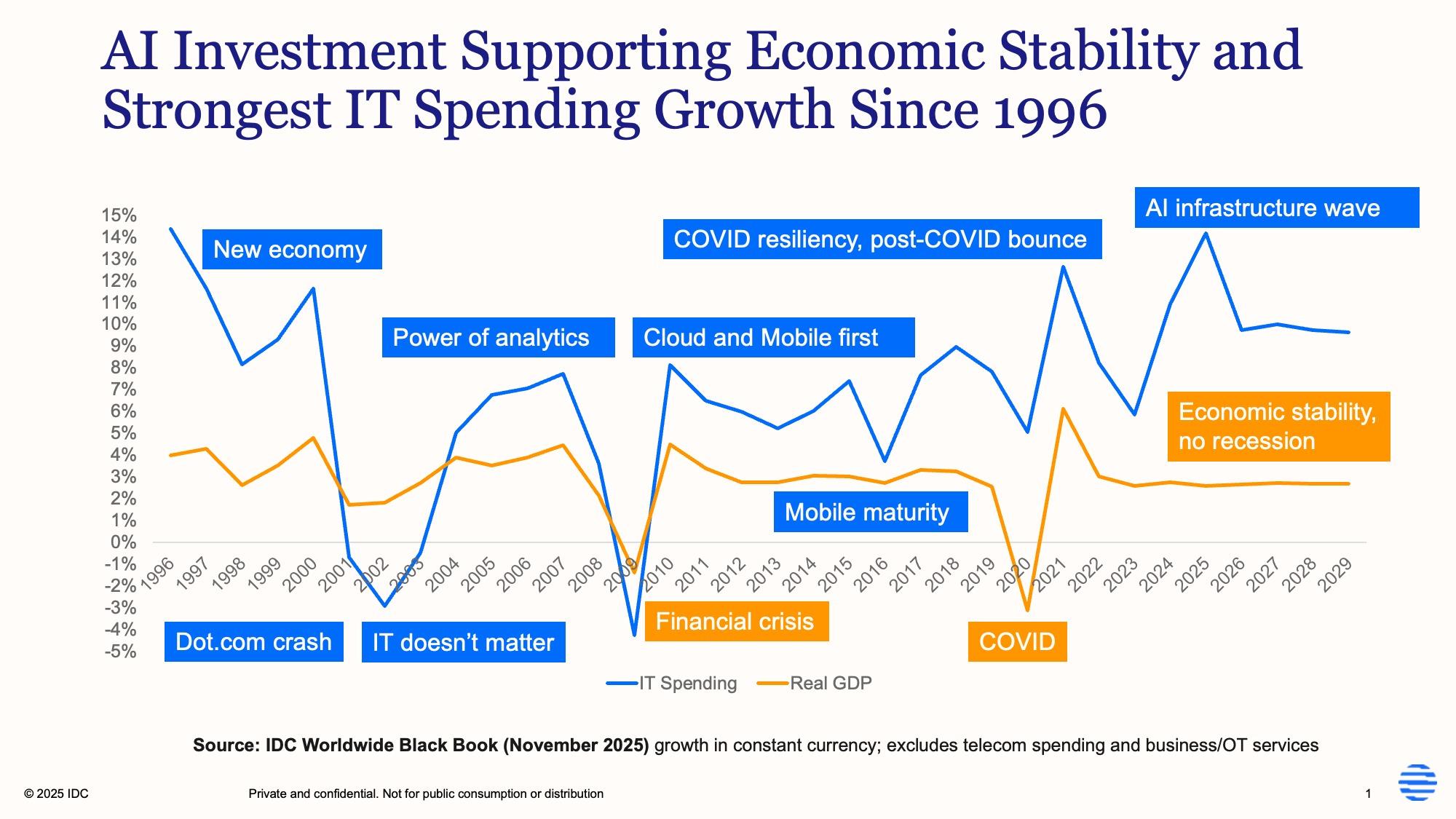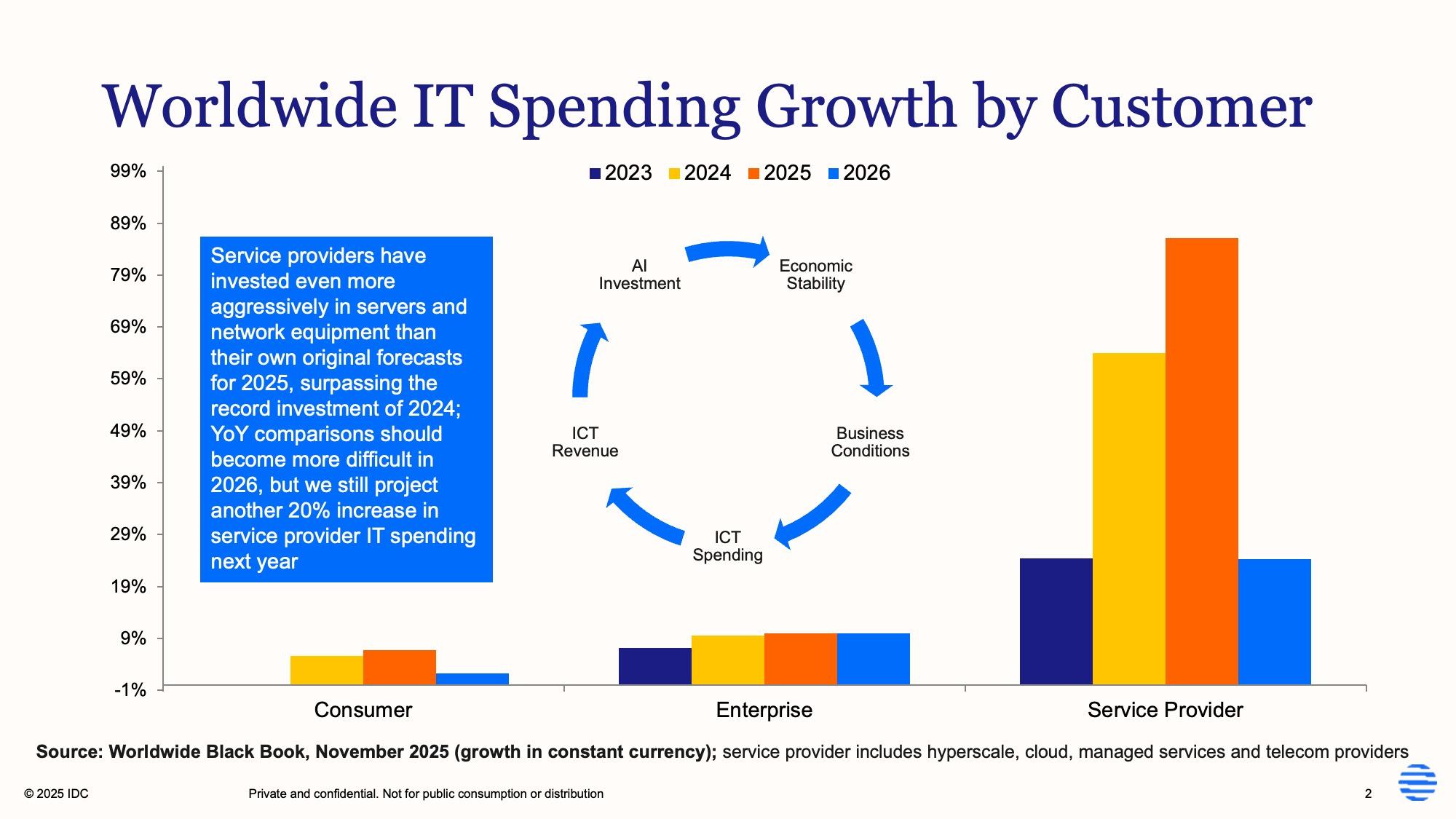 Stephen Minton, Group Vice President di IDC, descrive questa fase come un “circolo virtuoso” in cui la crescita tecnologica alimenta la stabilità macroeconomica e, allo stesso tempo, trae forza proprio dalla solidità dei principali flussi di spesa enterprise. Le aziende continuano a investire perché vedono nell’AI anche un fattore competitivo indispensabile. I service provider, a loro volta, capitalizzano questi ricavi per espandere ulteriormente le infrastrutture necessarie a supportare carichi di lavoro sempre più intensivi.