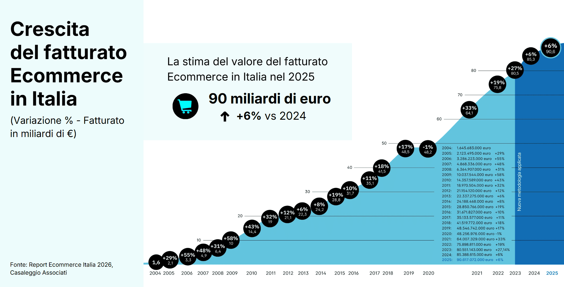 L’Ecommerce in Italia vale oggi 90,6 miliardi di euro, con una crescita del fatturato del 6% nel 2025. È il dato principale emerso dalla 20ª edizione dell’evento annuale di Casaleggio Associati sul commercio digitale, tenutosi ieri a Milano con oltre 350 professionisti del mondo ecommerce e la presenza sul palco di manager di aziende di primo piano. I settori trainanti rimangono Viaggi e Turismo, con un valore online stimato in oltre 22 miliardi di euro, seguiti da Marketplace (17,1 miliardi), Tempo Libero (13,4 miliardi) e, a seguire, Moda, Gambling e Alimentare.