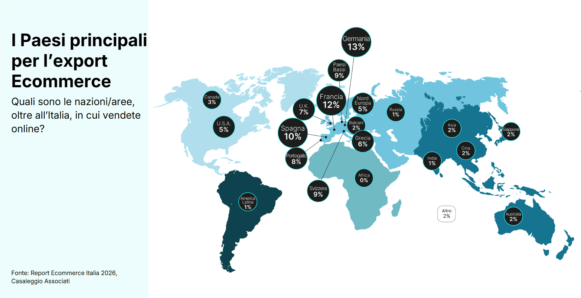 Infine, sul fronte della presenza internazionale, gli Ecommerce italiani si concentrano principalmente nei mercati europei. La Germania è il principale sbocco estero (13% degli operatori), seguita da Francia (12%) e Spagna (10%). Tra gli altri mercati rilevanti figurano Paesi Bassi e Svizzera (entrambi al 9%), Portogallo (8%) e Regno Unito (7%), mentre al di fuori dell’Europa gli Stati Uniti rappresentano il principale mercato con il 5% delle aziende presenti.