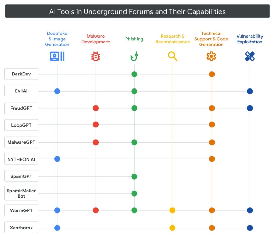 Il 2025 segna anche la maturazione del mercato nero delle tecnologie IA per il cybercrime. Il GTIG ha individuato una proliferazione di strumenti multifunzionali progettati per semplificare attività come il phishing automatizzato, la generazione di malware e l’analisi di vulnerabilità.
