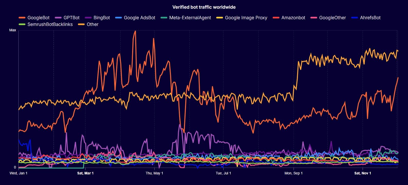 Nonostante queste richieste di maggiore chiarezza, il traffico bot continua a essere dominato da attori tradizionali. Oltre un quarto del traffico automatizzato proviene da Googlebot, utilizzato sia per l’indicizzazione dei motori di ricerca, sia per finalità legate all’AI, mentre Microsoft Bingbot svolge funzioni simili, ma su scala sensibilmente inferiore. Cloudflare precisa comunque che non tutti i bot sono dannosi e che l’azienda mantiene un registro di bot verificati impiegati per attività legittime come monitoraggio, sicurezza e scansioni applicative.