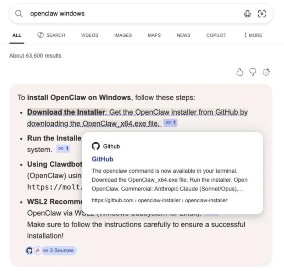 La truffa è stata particolarmente efficace perché sfruttava due elementi chiave di fiducia. Da un lato GitHub, piattaforma considerata affidabile da molti sviluppatori e già ricca di fork del progetto OpenClaw e, dall’altro, i suggerimenti AI del motore di ricerca Bing, che hanno contribuito a posizionare il repository fraudolento tra i primi risultati.