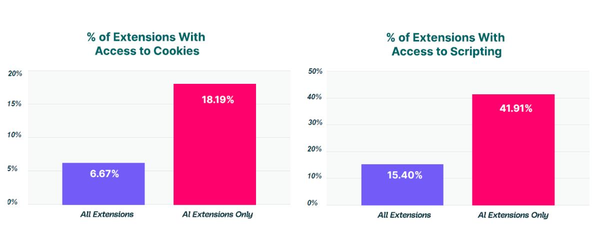 Sarebbe comodo supporre che le estensioni basate sull’AI comportino un livello di rischio comparabile a quello delle estensioni tradizionali. In realtà, hanno una probabilità del 60% superiore alla media di presentare vulnerabilità note, tre volte più alta di accedere ai cookie di sessione, 2,5 volte più alta di eseguire script remoti nel browser e il doppio delle probabilità di poter manipolare le schede aperte.