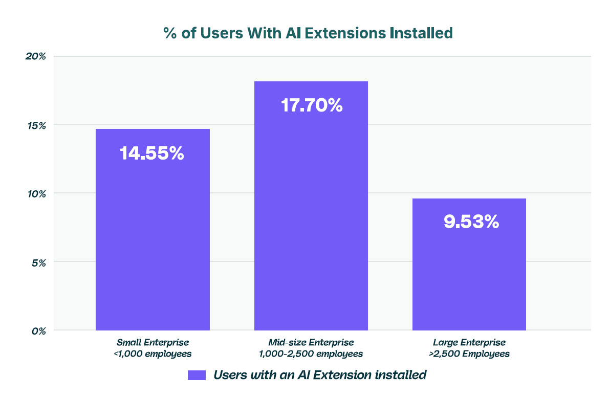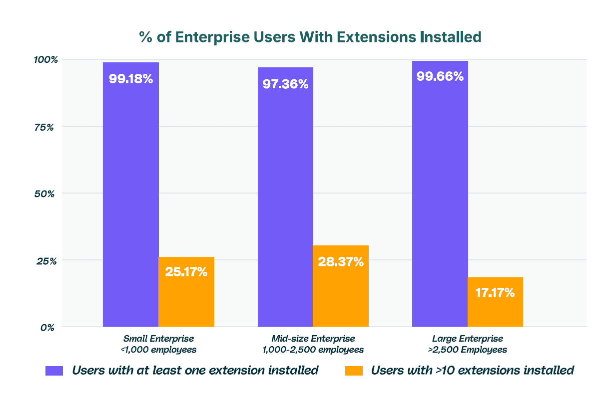 La prima resistenza che molti responsabili della sicurezza oppongono a questo tema è classificarlo come un rischio di nicchia, relegabile a una minoranza di utenti o a scenari limite. I dati del report smontano questa percezione in modo netto, riportando che il 99% degli utenti enterprise ha installato almeno un’estensione browser e oltre un quarto ne ha più di dieci attive contemporaneamente. Non si tratta insomma di una coda lunga da gestire marginalmente, ma di una condizione universale che riguarda l’intera popolazione aziendale.