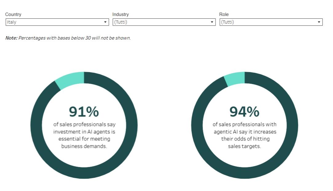 - Il 69% dei venditori italiani dichiara di avere già utilizzat agenti AI e quasi il 70% prevede di farlo entro il 2027. Una volta pienamente implementati, i venditori italiani stimano che gli agenti ridurranno del 31% il tempo dedicato alla ricerca sui prospect e del 34% quello necessario per scrivere le email, restituendo tempo prezioso ai team di vendita