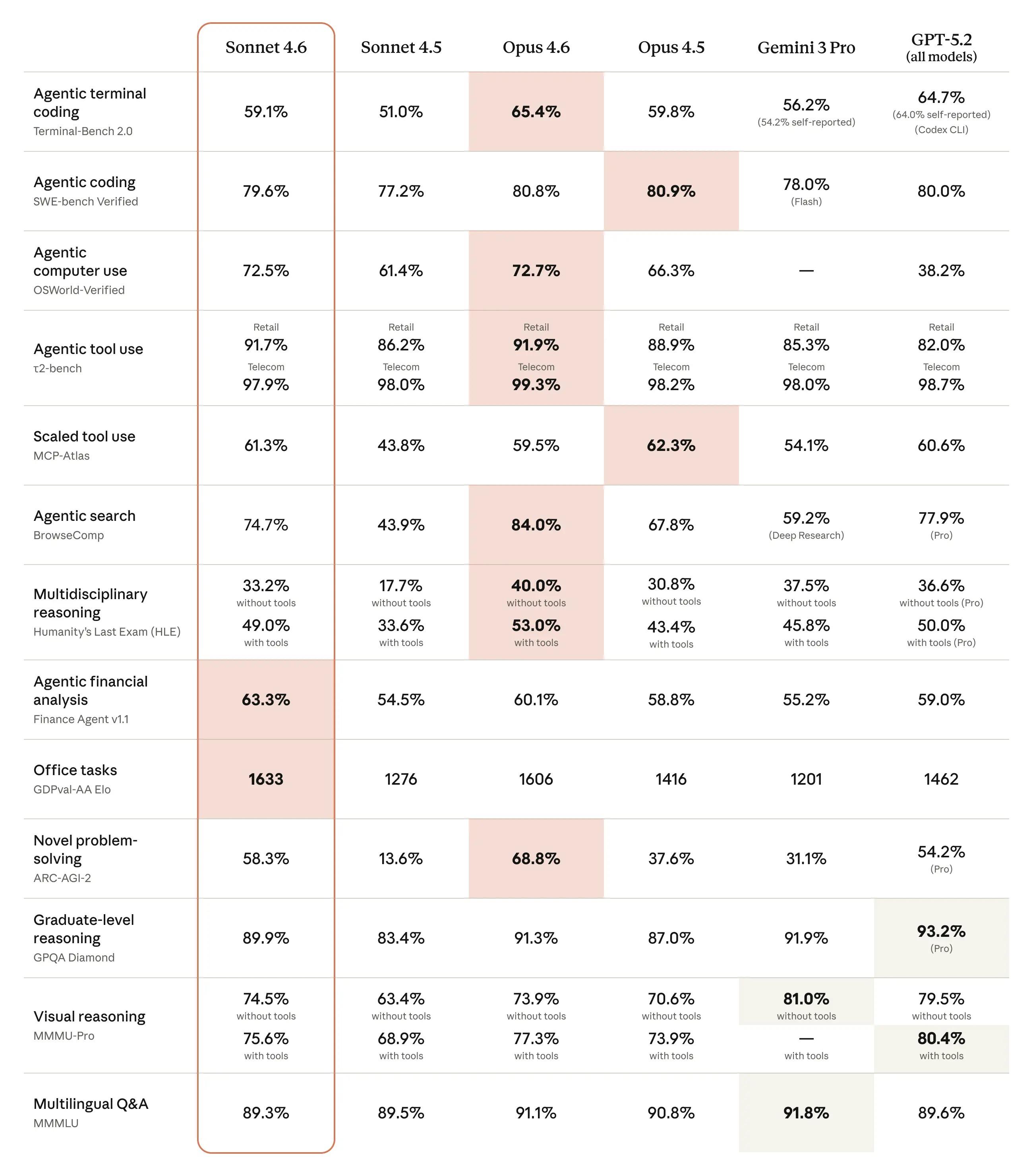 Nei dati pubblicati da Anthropic, Sonnet 4.6 passa davanti a Opus 4.6 in due categorie su tredici: analisi finanziaria agentica (Finance Agent v1.1) e task da ufficio (GDPVal-AA Elo). Il quadro generale resta comunque favorevole a Opus, che vince in sei categorie su tredici. Nelle rimanenti, i competitor principali (tra cui Gemini 3 Pro e GPT-5.2) risultano in testa in due categorie ciascuno, a dimostrazione di come i modelli di fascia alta stiano diventando estremamente vicini tra loro (la differenza reale spesso dipende da come vengono testati, dal tipo di prompt e dal contesto applicativo).