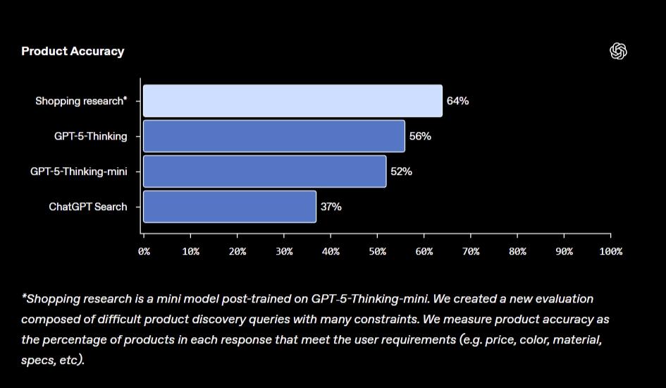 Questo fine-tuning è la chiave della sua superiorità. Le metriche interne, basate su un nuovo evaluation set composto da query complesse con vincoli multipli, mostrano che Shopping Research raggiunge un tasso di accuratezza del prodotto del 64%, un miglioramento significativo rispetto ad altri modelli GPT-5 (ad esempio, GPT-5-Thinking-mini si ferma al 56%). L’accuratezza è misurata come la percentuale di prodotti suggeriti che soddisfano effettivamente tutti i requisiti specificati dall’utente (prezzo, specifiche, ecc.).