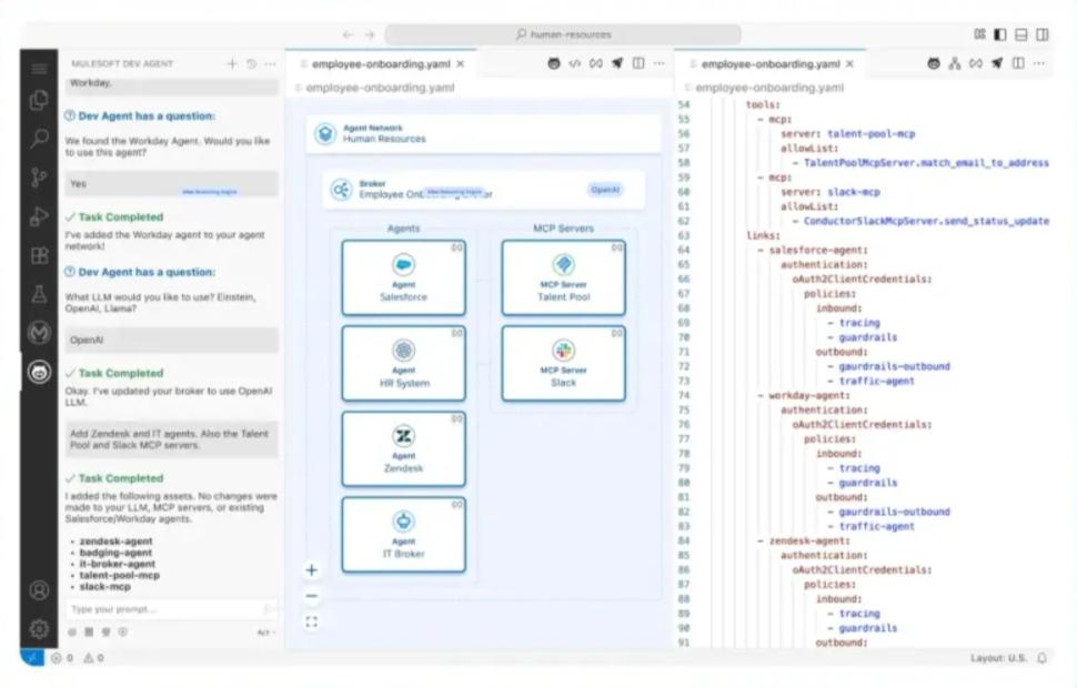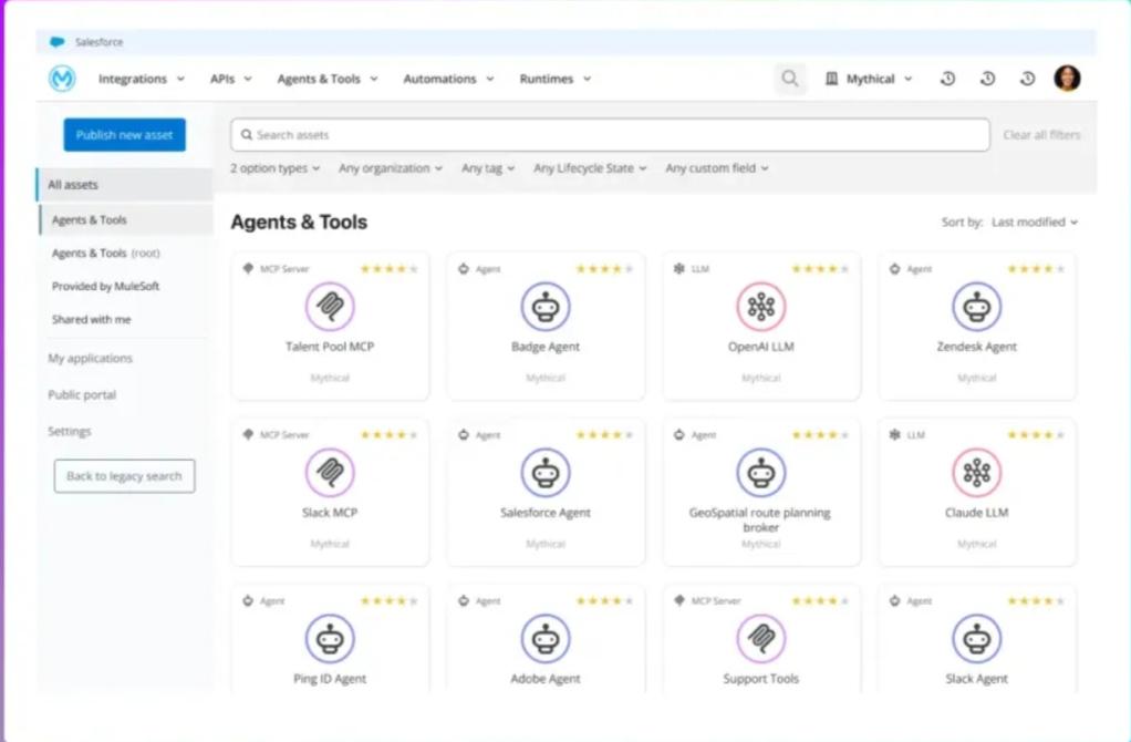 Riunire agenti e strumenti in un unico ambiente consente di ottimizzarne la gestione e il controllo in modo immediato e, con MuleSoft Agent Visualizer, le organizzazioni ottengono una vista completa dell’intero perimetro AI, con funzionalità avanzate di ricerca e filtraggio.