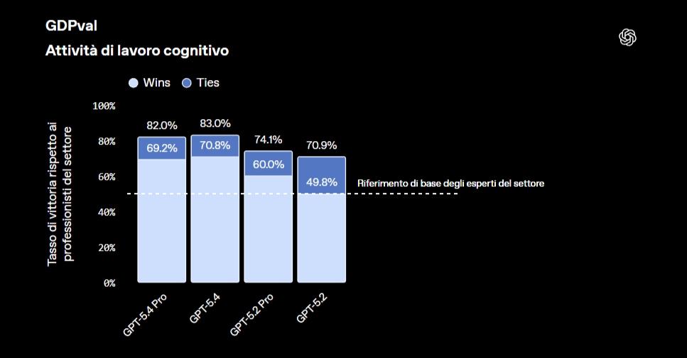 Un altro risultato rilevante riguarda il test GDPval sviluppato internamente da OpenAI per valutare le competenze nei cosiddetti knowledge work tasks, attività tipiche del lavoro intellettuale. GPT-5.4 ha raggiunto un punteggio dell’83%, il più alto registrato finora per questo benchmark.