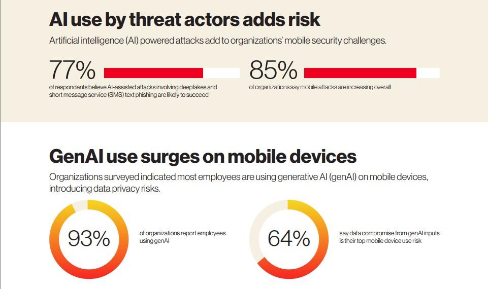 Il problema, evidenzia Verizon, è duplice. Da un lato, solo il 17% delle imprese dispone oggi di controlli di sicurezza specifici contro gli attacchi supportati dall’IA, mentre dall’altro il 93% dei collaboratori utilizza strumenti di GenAI sui propri dispositivi mobili per attività lavorative quotidiane, spesso senza consapevolezza dei rischi.